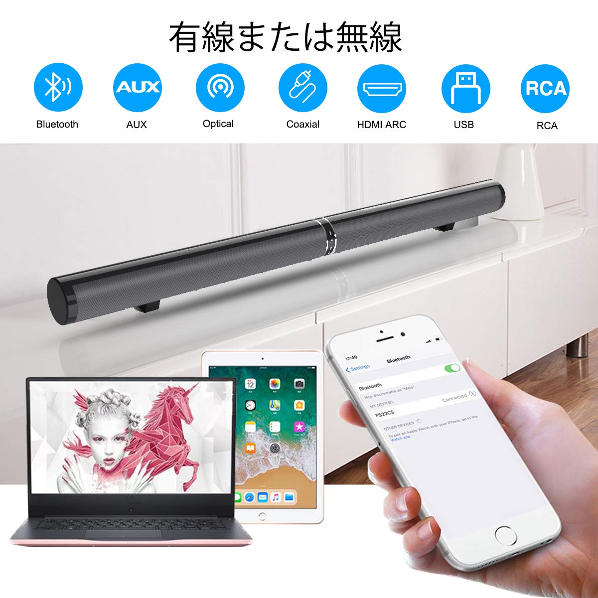 スマートフォン、タブレット、ラップトップなどのBluetooth対応モバイルデバイスからワイヤレスオーディオをストリーミングできます。
