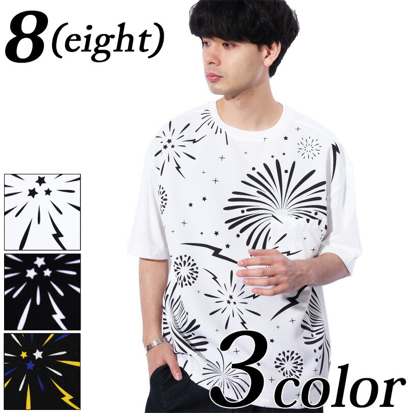 Tシャツ メンズ 半袖Tシャツ全3色 新作 シャツ ポリエステル 花火柄 ホワイト 白 Tシャツグランジ ビッグ シャツ M L アメカジ ストリート 海 夏に♪ 8(eight) エイト 8 【ゆうパケット対応商品】